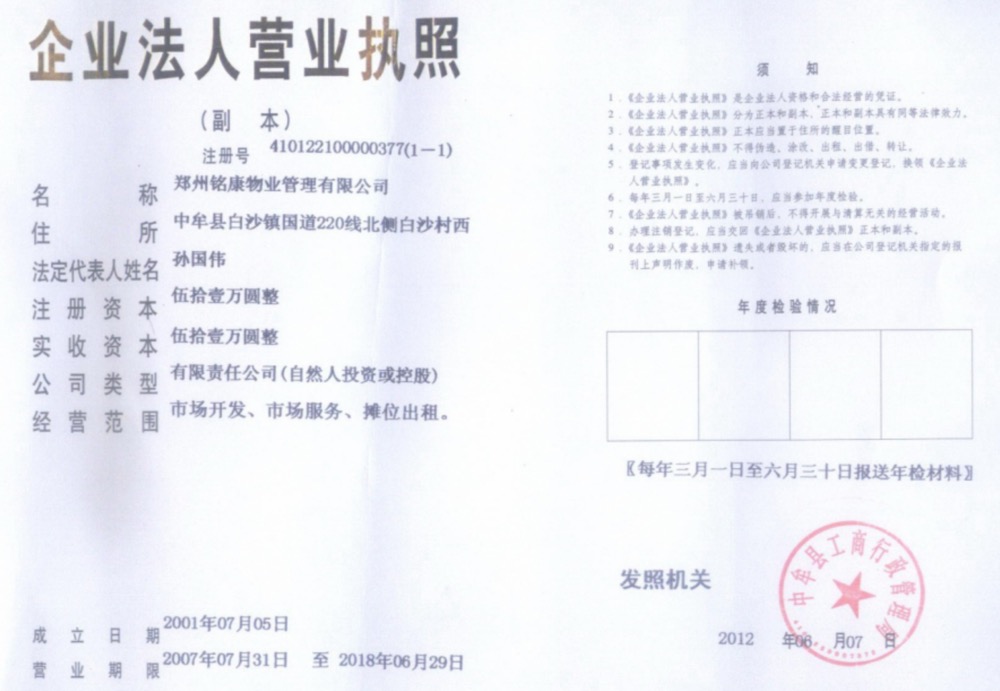 在这个通知书下达郑州铭康物业管理有限公司后至2012年6月7日,受害人孙国伟恢复郑州铭康物业管理有限公司法人前见图片