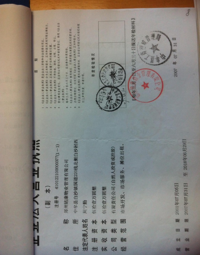 2004年周宁勤非法获得郑州铭康物业管理有限公司法人代表时的营业执照见图片。