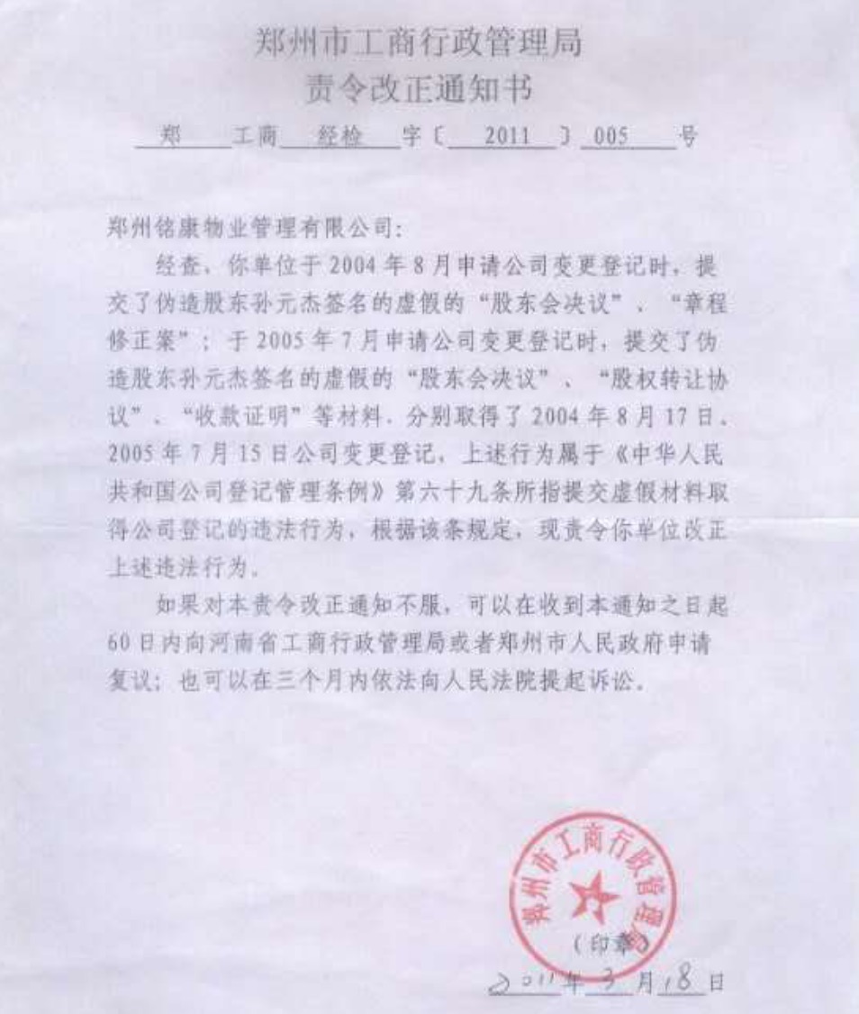 郑州市工商局在接到郑州铭康物业管理有限公司股东孙元杰投诉举报周氏家族侵占股权后,依法下达的让郑州铭康物业管理有限公司自行整改通知书见图片