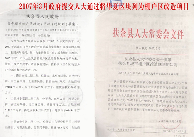2007年3月30日,扶余县人大通过的“扶余县城市棚户区改造规划的决定”,已将德卡小区工程即“华夏区块”列为棚户区。