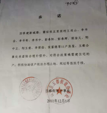 2010年,为支持镇平县修建新城路,玉都办五里岗村民李书全一家忍痛舍弃正在经商的门面商铺,奔着舍小家为大家尽心尽力的支持县里工作,他们的门面商铺被玉都街道以置换形式拆迁。