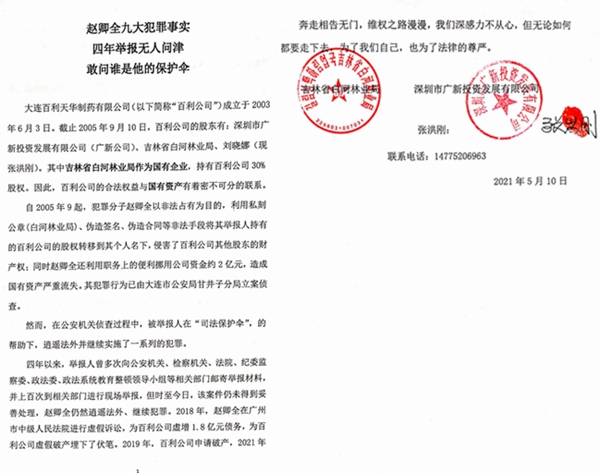 四年以来,举报人曾多次向公安机关、检察机关、法院、纪委监察委、政法委、政法系统教育整顿领导小组等相关部门邮寄举报材料,并上百次到相关部门进行现场举报。但时至今日,该案件仍未得到妥善处理,赵卿全仍然逍遥法外、继续犯罪。2018年,赵卿全在广州市中级人民法院进行虚假诉讼,为百利公司虚增1.8亿元债务,为百利公司虚假破产埋下了伏笔。2019年,百利公司申请破产,2021年百利公司原股东权益调整为零,国有资产流失上亿元。
