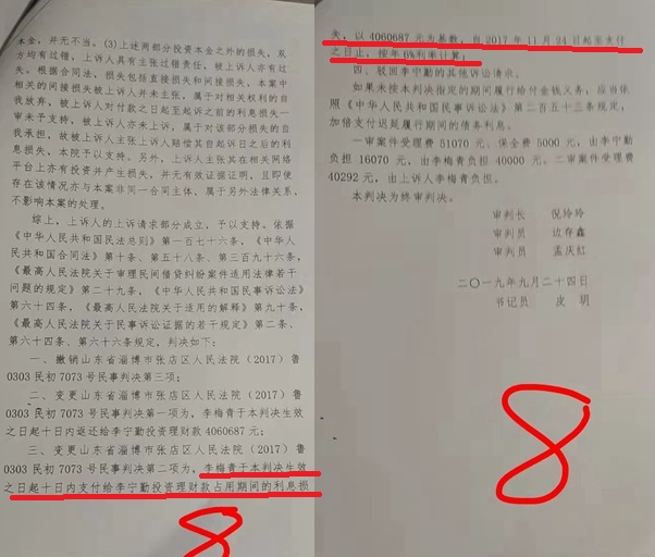 李宁勤拿着国家的空饷不上班,这些年却把时间和精力都用在以理财为幌子,骗取大众的存款上。2016年,她到处宜称她丈夫是证券公司老总,撒谎称她丈夫公司考察且投资过的(SMT和UC摩根等)网络优质项目,是百年一遇只赚不赔的金矿,让大家把钱打到她银行卡上。得手后,她又谎称:平台关闭,大家的本钱要不回来了。可她却瞒着所有受害者,以个人名义起诉SMT和UC摩根项目方,官司贏了之后,将属于UC摩根众多受害者的200多万元据为己有(有法院裁判文书为证,2016鲁0303民初6612号),始终不返还给受害人。尝到甜头后,2017年11月,李宁勤瞒着大家又以个人名义把SMT项目方告上法庭,2018年年初,有受害者发现后把李宁勤告上法庭,眼看骗术暴露。2018年8月,她以替大家要钱和将委托书放入案宗为由,诱骗受害者必须按照她拟好的模板补写委托书,但是,这些委托书她却从来没有上呈给法庭,导致受害者无法主张自己的权利,企图再次侵吞受害人的400余万元钱款,逃脱自己的刑事责任。李宁勤通过这些行骗手段,发起组织了好几个类似的骗局(有微信截屏为证)。在短短的几年时间里,她购买了多套房产(有的转在她儿子许尧名下)。其中青岛崂山区山水名园2套豪宅,共计280多平米,价值千万余元。她在青岛还有其它房产。她自己还讲,她在淄博人民公园附近的商务楼(原中信证券办公场所),和别人共同投资拥有商业房产。李宁勤和她丈夫都是国家公职工薪阶层,她儿子曾在国外私立大学读书几年,花费巨大,作为工薪阶层,如何能拥有这么多的巨额财产,就不言而喻了。