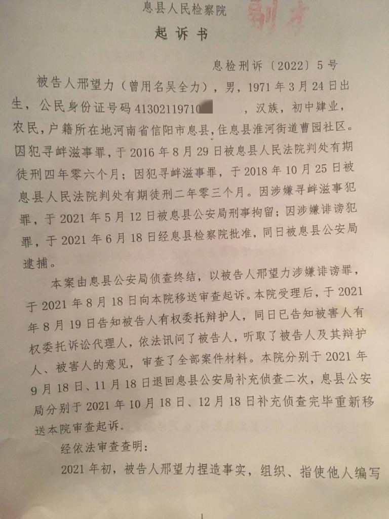 邢望力于2021年4月份前往信阳市灵山县探望被当局非法软禁两年多的人权律师江天勇,随后遭到息县淮河派出所的威胁,遂前往北京邮寄信件被带回当地,先以寻衅滋事行政拘留十五天,期满后5月12日,以涉嫌寻衅滋事羁押于息县看守所,6月18日被息县检察院检察官刘彦君以涉嫌“诽谤”时任息县县委书记金平、时任息县宣传部长李学超、时任息县公安局长刘洋等人批捕,先后两次退回公安补充侦查。2021年12月17日,息县公安局办案人员补充卷宗再次到息县检察院,该案件承办检察官也随之由原先的刘彦君变更为毛强。2022年1月18日,息县检察院将邢望力案移送息县法院起诉,法官为李学国。