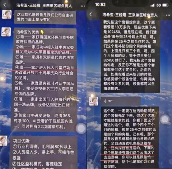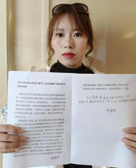 我们是北京洁希亚国际洗衣总部重庆市万州区的加盟商姚春梅、林晓平,我们今天通过网络媒体揭露北京洁希亚国际洗衣总部卖给我们的机器设备怀疑是二手翻新、虚假宣传、售后服务无保障等诸多问题。我们愿意对反映问题的真实性负责,如有不属实,愿意负法律责任,与他人无关。并通过我们的被骗经历提醒广大加盟商,北京洁希亚国际洗衣总部在网上宣传的所谓机器设备好、优惠活动力度大、后期总部全程扶持等承诺涉嫌虚假宣传,不要上当受骗。林晓平、姚春梅提供的事情经过:我们是2019年加盟的洁希亚干洗店,当初之所以决定加盟北京洁希亚国际洗衣总部,是因为北京洁希亚国际洗衣总部的业务员王超介绍说他们是全国知名品牌,总部在北京,机器耗材都是最先进的节能环保产品,还有强大的售后服务和保障等等诸多承诺。在北京洁希亚国际洗衣总部业务员王超的轮番洗脑下, 我们最终决定加盟北京洁希亚国际洗衣总部,一共投入25万多元才将这个加盟店开起来。