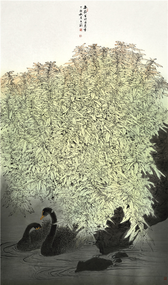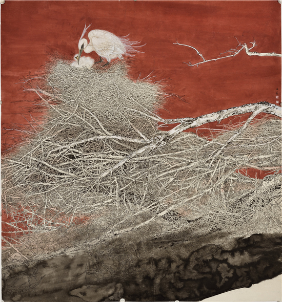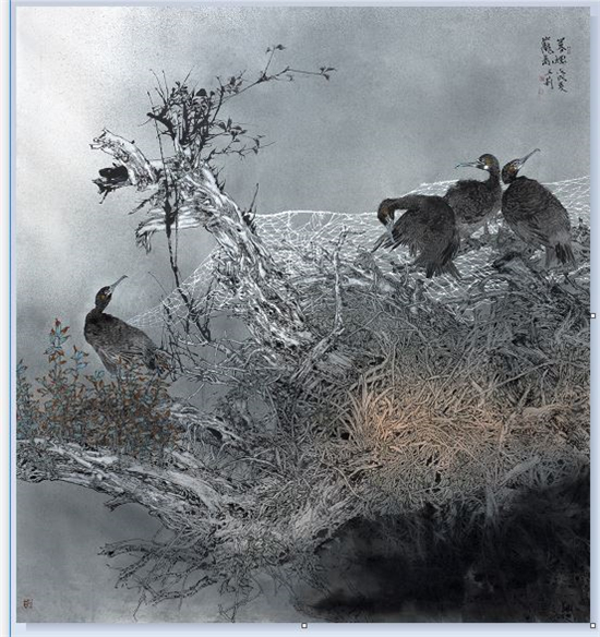 她的作品,既注重形式更讲究笔墨。每一幅构图都精心推敲,在构成上大胆出新、出奇,给人以强烈的视觉冲击;同时,她充分利用线条来表达物象,通过用笔的技巧,灵活表达物体的本质精神。不论是枝叶还是树石,不论是飞鸟还是草虫,都能做到笔简意繁,态随意变,前人所谓的“寓刚健于婀娜之中,行遒劲于婉媚之内”,正是她用笔方法的具体体现。通过轻重,深浅、虚实的线条变化,真正做到了柔中带刚,一笔三战,有皴擦,有顿挫、有勾斫,笔断意连,一气贯穿,从而在画面上使人看到的不仅仅是笔墨更是具体物象的形神传递。