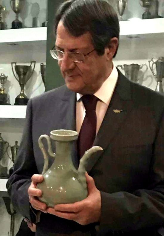我国著名青瓷艺术家、大国工匠李震青瓷作品"竹节壶"被塞浦路斯共和国总统尼科斯·阿纳斯塔夏季斯收藏。