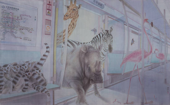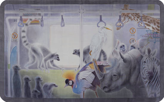 《欢乐谷》似乎在用动物世界的眼光来考量人类,这种图像创造的意味并不是对人类创造的物质文明的欣赏。因为人类在用现代文明隔离与自然的亲和关系,正像人类在居住的城市通过制造“欢乐谷”来豢养动物、观赏动物一样,人类也在用自己创造的现代文明将人类自身圈养起来。或许,在动物看来,这其实才是被他们观看的一个“欢乐谷”。这幅作品显然不同于以往所有的花鸟画、人物画,而是以图像再造设计了一个离奇的情境,画面固然是优美的,但画作直击人们内心的却是比这种优美更加深刻的思想和观念。地铁是当下中国城市发展中最具鲜明科技和机械制造特征的生活空间,但恰恰是这个科技空间却到处充满了动物的嬉戏、漫步、伫立和凝视。这个空间设计显然是画家的图像创意。