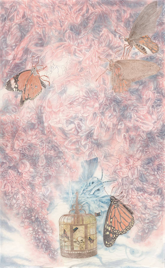 工笔画的“当代性”是近些年工笔画界的一个热词。这种“当代性”显然不是指工笔画艺术语言上的形式探求,或工笔画语言从图像语义的表达中脱离出来,将线条、色彩、笔墨等作为艺术变革的本身,而是对工笔画创造图像并对其进行观念赋值的一种探索。譬如,工笔花鸟画长期以来都是在“写生”与“提炼”中寻求新艺术风格的生成。“写生”要求画家从观察对象着手,从中感受对象的生命体态;“提炼”则是从临摹获得工笔花鸟画的传统语汇,再对所观察对象进行工笔画传统语汇的对位进而推进艺术个性的再创造。在现代主义的理念下,工笔花鸟画可能会对花鸟进行某种形式规则的形变,视觉秩序、节奏、平面化等成为花鸟画家试图从自然对象中进行内在结构创造的一种艺术纯化。但工笔画的“当代性”并不完全是从这种绘画语言中寻找突变,而是在怎样创造图像上下功夫。也即花鸟形象不再遵从其所在的原本的自然时空,而可能将花鸟形象作为某种观念的符号予以重组,抽离形象原本的自然时空进行所谓的观念化叠合与再造。这种非日常视觉的图像建构,成为画家进行艺术创造的价值视点,采用什么母题形象、对其进行怎样的编辑叠合,也便成为艺术家观念创意之所在。