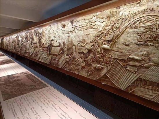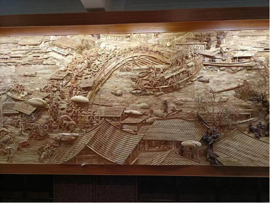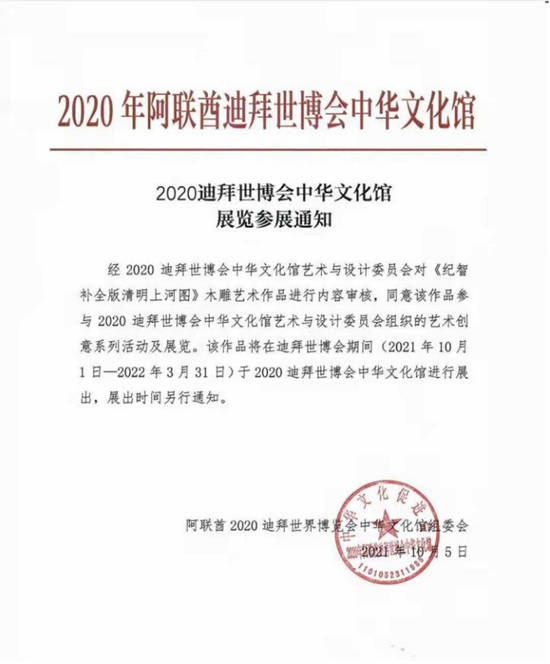 黄花梨木雕《纪智补全版清明上河图》原作总尺寸长88米、宽2米。共用黄花梨木20余吨,整幅作品采用“浮雕、透雕、圆雕、镂雕、层雕、禅雕等”多层次“风采横溢,妙在画外”的创新技法,将张择端本《清明上河图》以珍稀木材再现于世,作品栩栩如生,人物、景观造型逼真,呼之欲出。此木雕作品已获国家版权登记,并于2019年荣获第四届“中国林业产业创新奖”。我们这次能参展2020年迪拜世博会中华文化馆,这是木雕作品历史空前的记录,也让我们为之欢欣鼓舞。