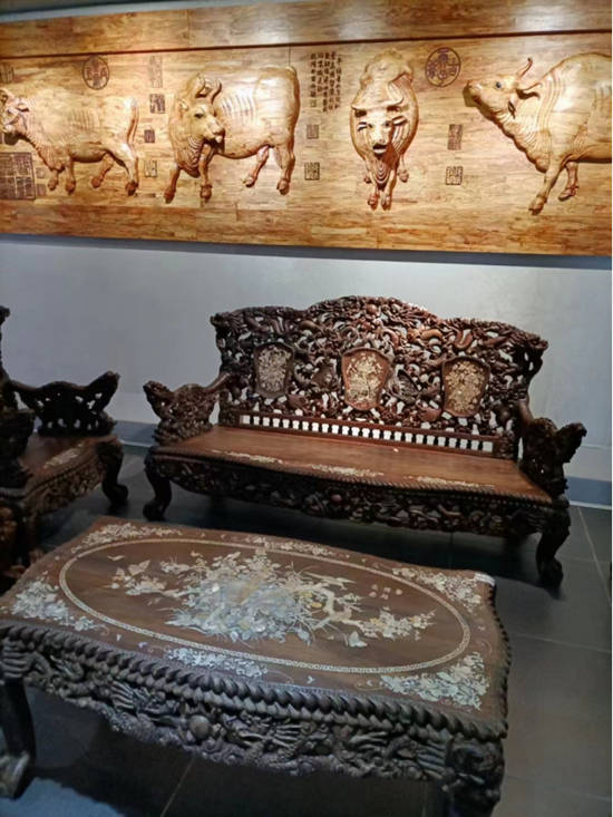在这个百花齐放百家争鸣的新时代,我的耕耘,如同鲁迅先生笔下的孺子牛,在某些朋友看来为时已晚。但是我更看重的是精神的寄托。十大传世名画中的五牛图精品黄花梨木雕作品被我放置在聚典阁大厅的正中间,这或许代表了我根植于内心深处的文化信仰,也是我的精神图腾。