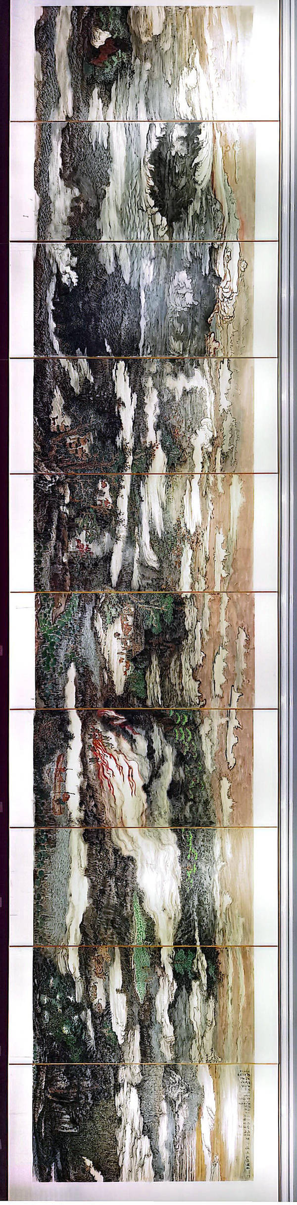 《画说雄安》是一幅极具史诗意义的横幅巨幛,远观此作给人以远古华夏艺术图腾精神的气脉迭宕,会让人体验到作者笔墨造境中的宏阔幽深,神秘苍茫与天人合一,追溯了雄安刀耕火种的遥远历史,满纸烟云,定位了雄安磅礴淋漓的主题感觉;作者以宏阔的审美视野与深厚的学术定力沉潜在历史文脉的源头,对话天地、取精用宏,并用宏大叙事的文学构想拼合精湛的笔墨语言,在有无之间、传统和现代之间演进了水墨艺术穿越五千年文明时空的文化表达,创造性地再现雄安作为丝路首端的辉煌历史;进入承载了丰厚历史的部落,集镇、观民风,体民情,带回来的是悠悠不变的民族文化本质和华夏大地自古至今的元气,流溢出今人面对历史的豪情壮志,从画幅中承载的精神份量上凸显出艺术家的家国情怀与文化担当。
