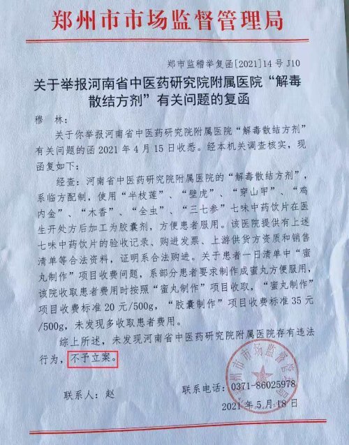 郑州市市场监督管理局于2021年5月18日《关于举报河南省中医药研究院附属医院“解毒散结剂”有关问题的复函》称,经调查核实,该药为“在医生开处方后加工为胶囊剂,方便患者服用。”关于患者一日清单中“蜜丸制作”项目收费问题,系部分患者要求制作成蜜丸方便服用。“未发现河南省中医药研究院附属医院存有违法行为,不予立案。”