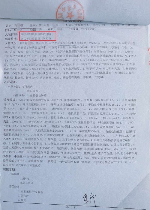 2019年3月28日穆某刚的父亲穆某卿出现咳血,随即去世。就在去世前的3月26日,穆某卿刚刚结束在河南省中医药研究院附属医院的治疗,“情况稳定符合出院标准”办理了出院手续。出院医嘱:按时服药,定期复查,不适就诊。