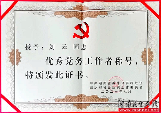 绿之韵集团党委书记刘云被授予湖南省“优秀党务工作者”荣誉称号