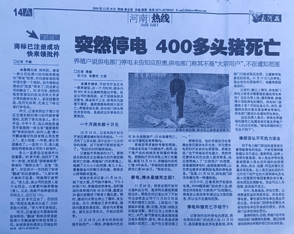 第一次发生在2009年11月份,刚下完大雪,天气格外寒冷,养殖场突然停电。当时猪场保育箱有42头仔猪,温度由29度骤然下降至0度,养猪场供水水管冰冻。次日又多次停电,温度忽高忽低,饮水水管冰冻无法饮用,随后猪场发生异常,近八百头生猪病死超半。当地畜牧专家称原因就是多次停电温度忽高忽低,饮水水管冰冻无法饮用,造成猪感染疾病大批死亡。原开封县供电公司杏花营供电所事先未告知养殖场停电。养殖场用电量大与供电公司杏花营所长经常联系,也被纳入“大宗客户”范围,承诺遇到停电时会及时通知,以前也多次被通知,这次他却没有接到停电信息。这件事影响很大,河南电视台、大河报等媒体都做了报道。最后在多方努力下,双方协商解决此事,双方于2010年4月12号签订供电合同,并架设一台专用变压器,明确该变压器所有权归养殖场所有。