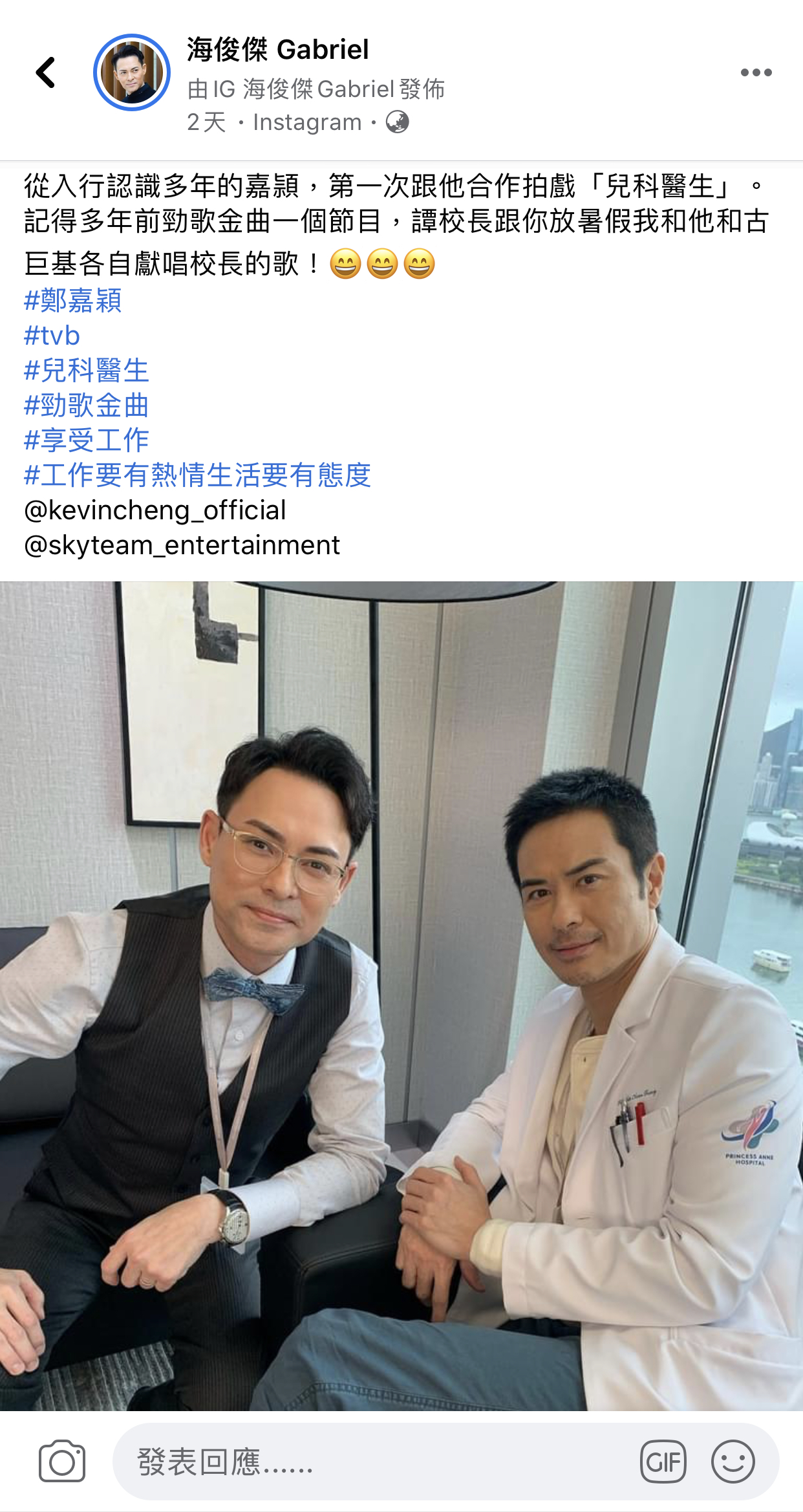 正在拍摄新剧《儿科医生》的海俊杰日前系社交平台上载了一张跟郑嘉颖合影,大家除了大赞两位保养得宜之外更称两个十分相似,就如失散兄弟。